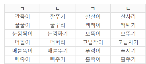 여기서 주의할 단어는 ‘개구리’와 ‘뻐꾸기’이다. ‘개구리, 뻐꾸기’는 의성어 ‘개굴개 굴, 뻐꾹’과 관련이 있으므로 ‘개굴이, 뻐꾹이’로 적어야 할 것 같지만 국어사전에 ‘개 굴하다, 개굴거리다’와 ‘뻐꾹하다, 뻐꾹거리다’는 실려 있지 않다. ‘귀뚜라미, 매미’ 등 도 ‘귀뚤하다, 귀뚤거리다’, ‘맴하다, 맴거리다’ 등이 사전에 올라 있지 않다. 이와 비 슷하게 ‘얼룩’ 또한 ‘얼룩하다, 얼룩거리다’가 나타나지 않으므로 ‘얼룩얼룩한 점’, ‘얼 룩얼룩한 점이 있는 동물’의 의미를 지닌 말을 ‘얼룩이’가 아닌 ‘얼루기’로 적는다.